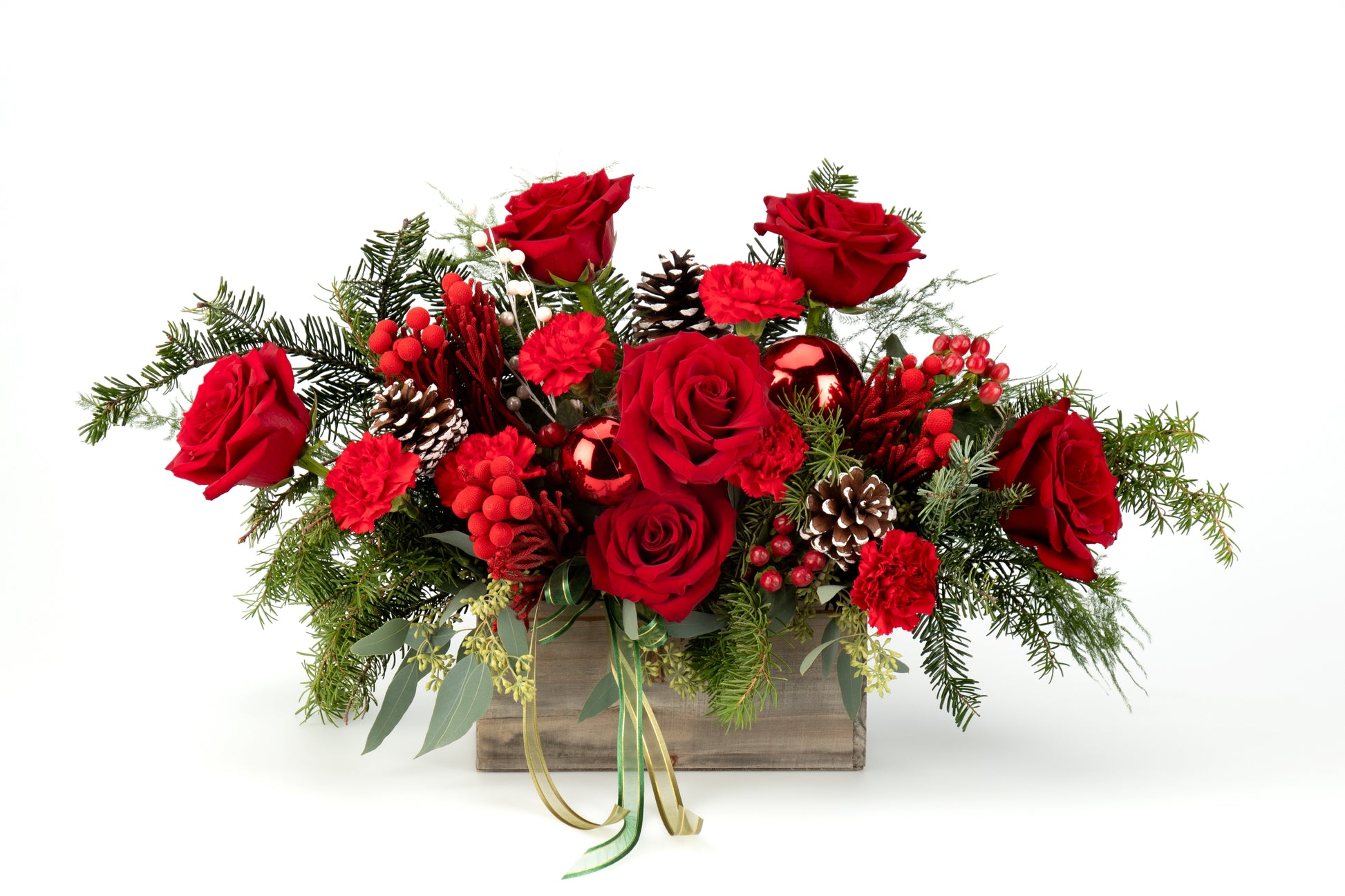 This arrangement is the epitome of the holiday spirit with its rich red roses conveying deep affection, carnations symbolizing admiration, and pinecones and berries adding a traditional Christmas touch. It’s perfect for a festive celebration.