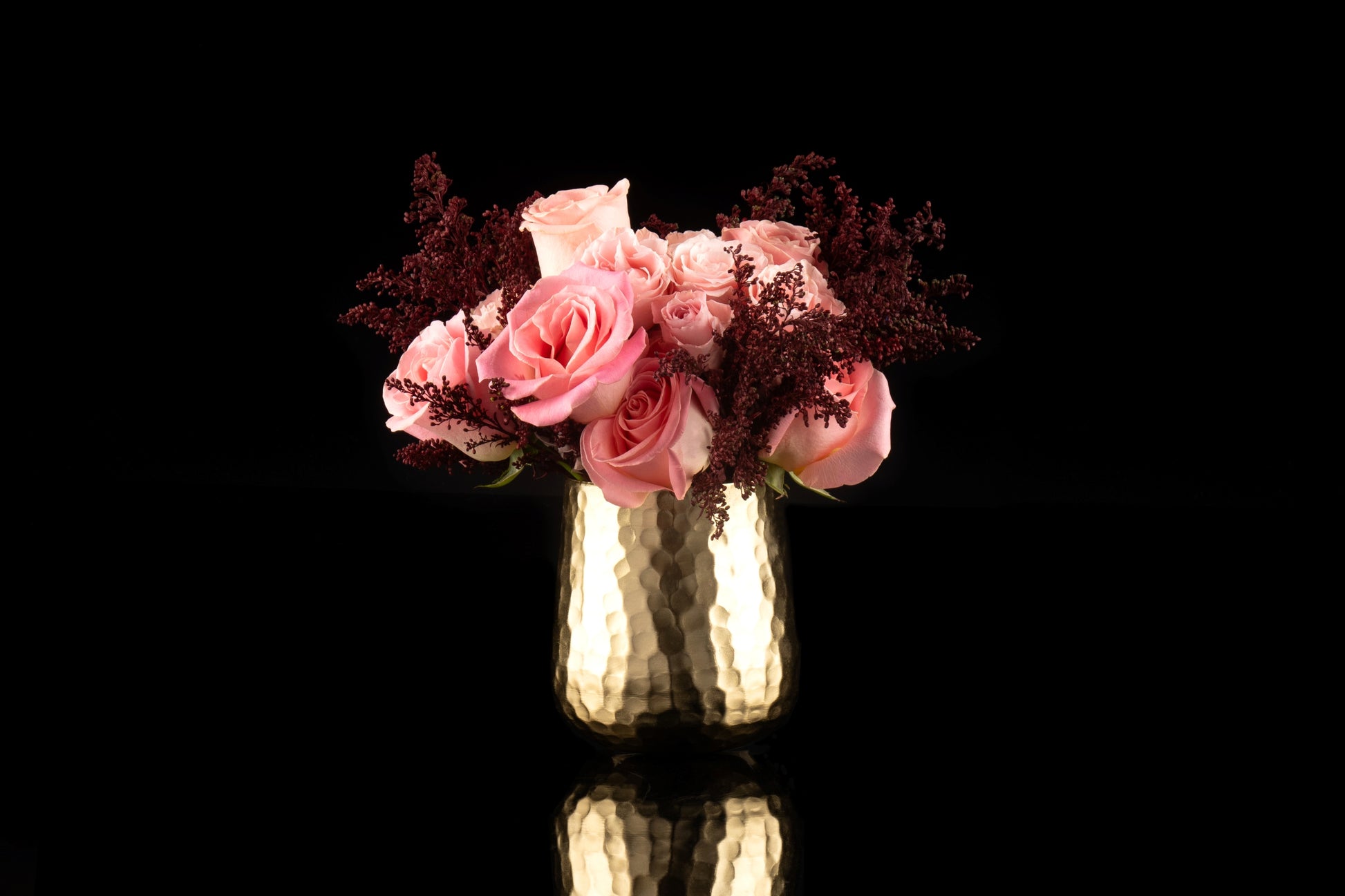 An elegant and simple arrangement that speaks of the subtle beauty of dawn with its soft pink roses representing admiration and grace. The darker foliage provides a beautiful contrast, creating an image of roses covered with the fresh dew of a new day.