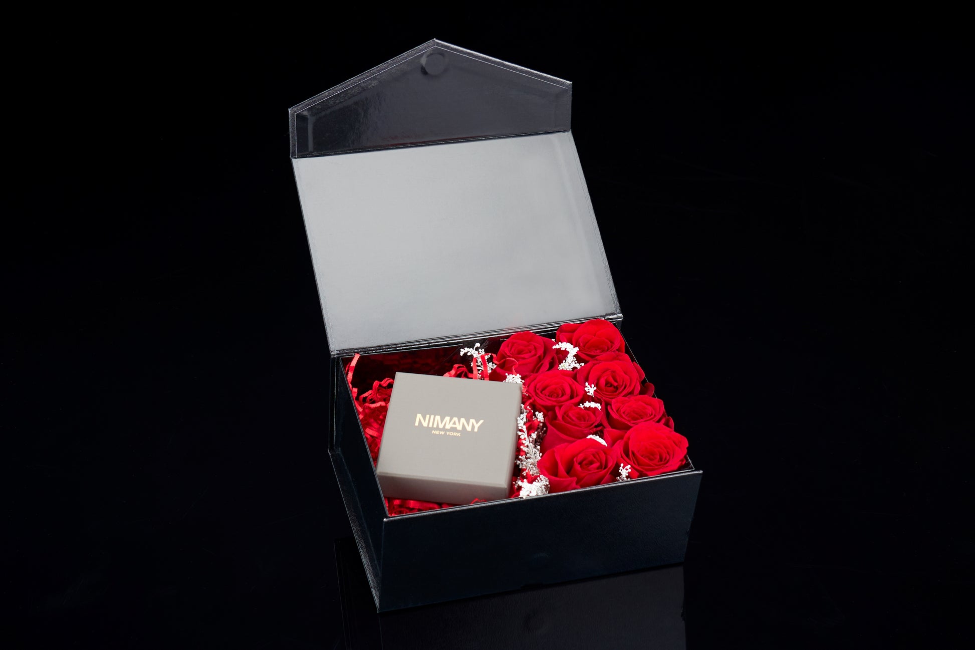 A sophisticated, black box opens to reveal a hidden layer of rich red roses, paired with a small, elegant gift box, creating a luxurious and romantic gesture.